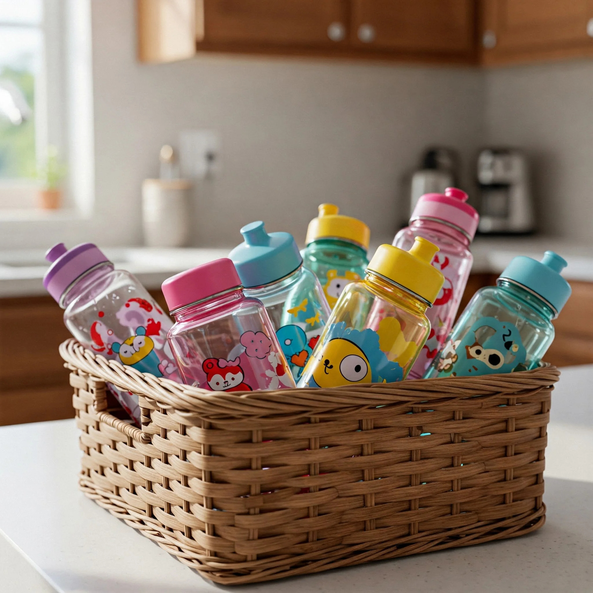 Each of my kids has a marked water bottle that lives in a basket in the kitchen for quick and easy access. I offer it at meal times and snack times, and it stays visible so they can be reminded and retrieve it themselves.